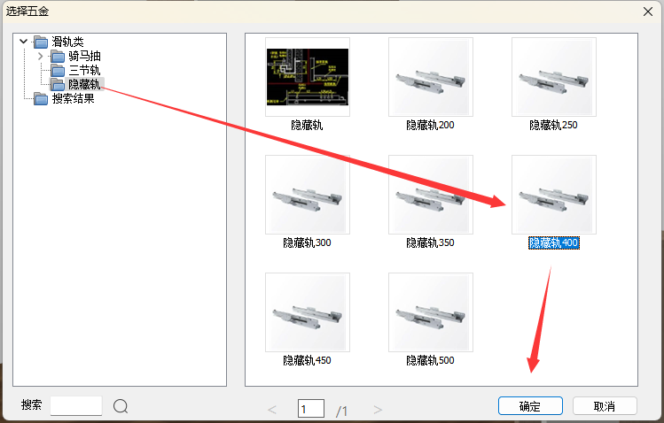 第4步:在弹出的对话框中,选择隐藏轨目录,选择合适尺寸的隐藏轨后,点击【确定】即可,如下图操作流程。